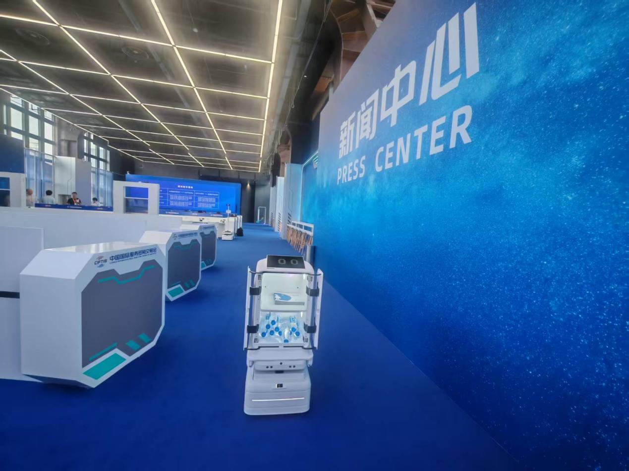 在服贸会新闻中心穿梭为媒体提供送水服务的机器人。中国经济网记者杨秀峰/摄