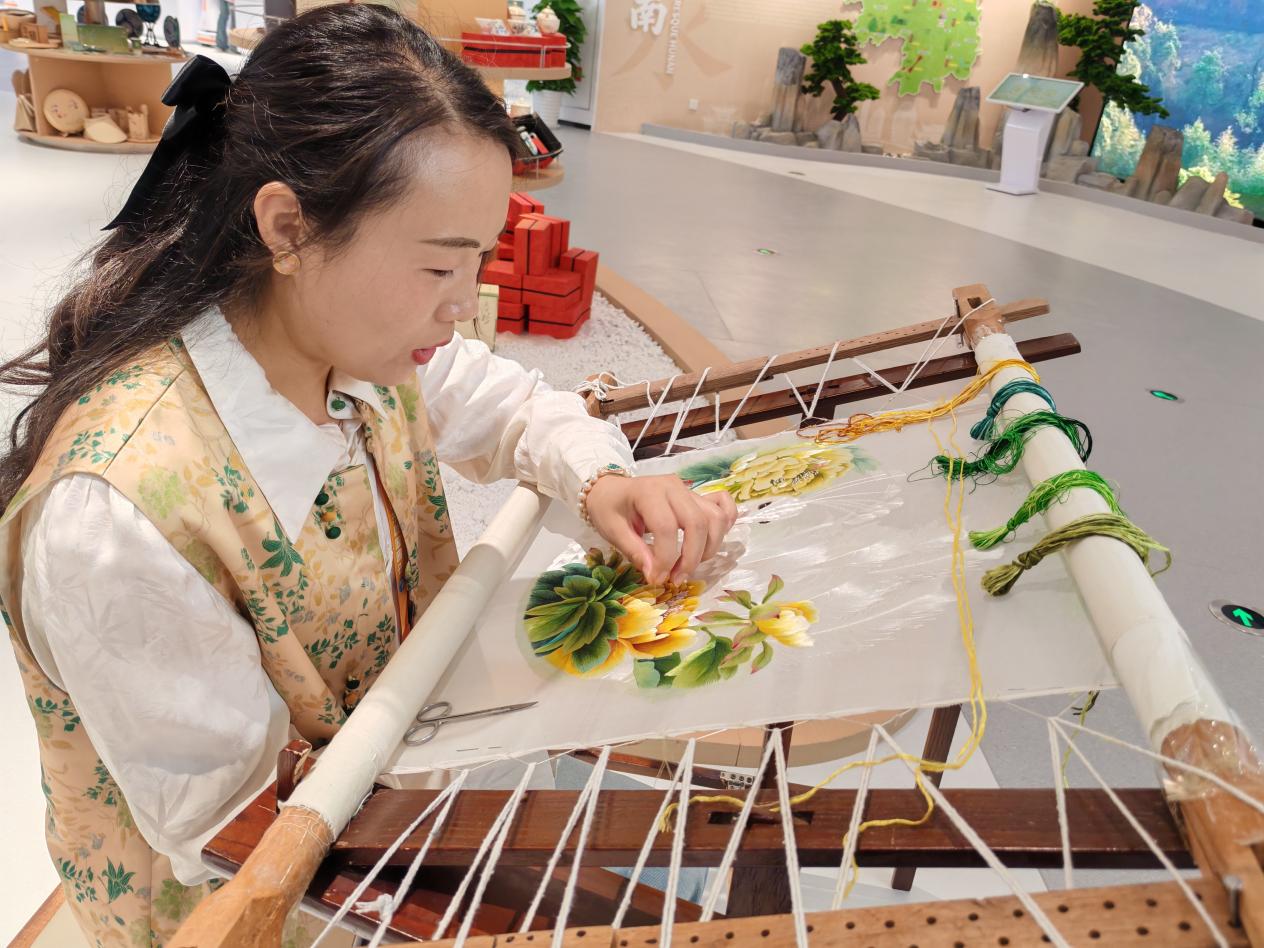 11月4日,记者来到进博会现场国家会展中心(上海)探馆。图为湖南馆湘绣传承人现场展示双面绣技艺。中国经济网记者 杨秀峰 摄