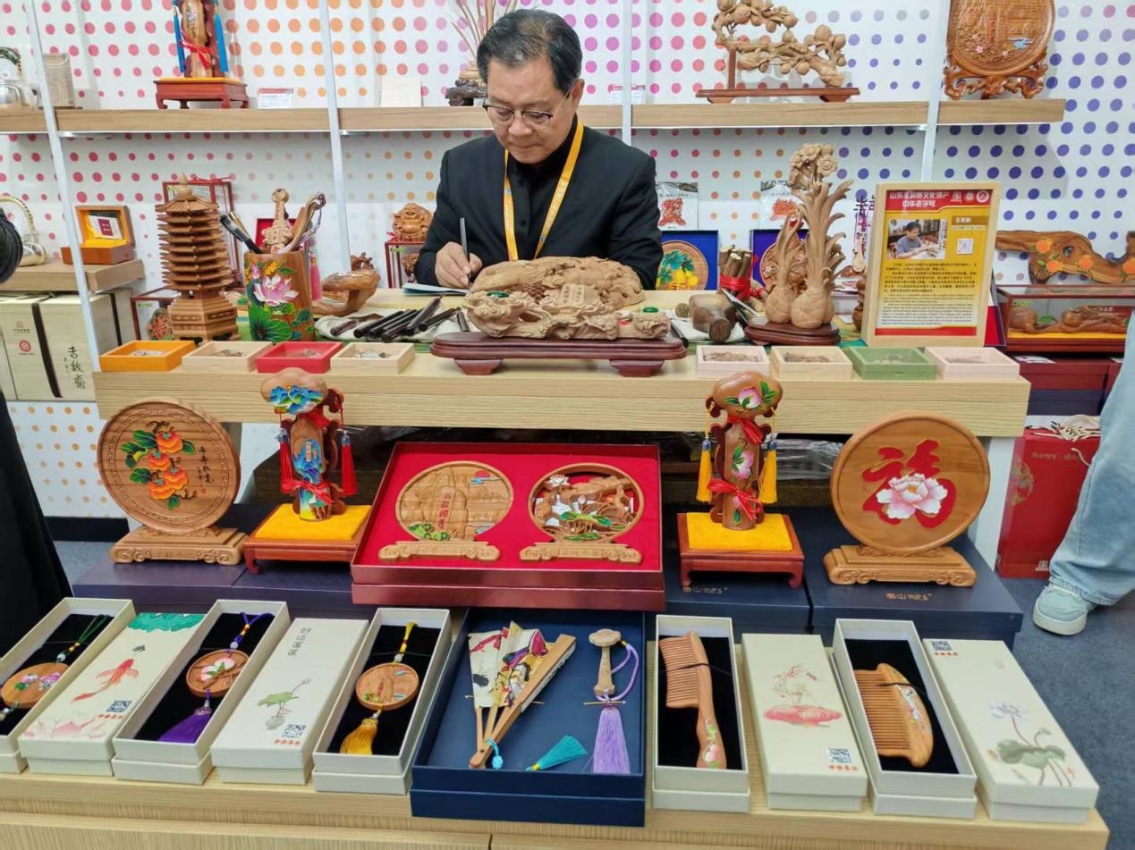 11月4日,记者来到进博会现场国家会展中心(上海)探馆。图为山东馆展示的非物质文化遗产肥城桃木雕系列产品。中国经济网记者 杨秀峰 摄