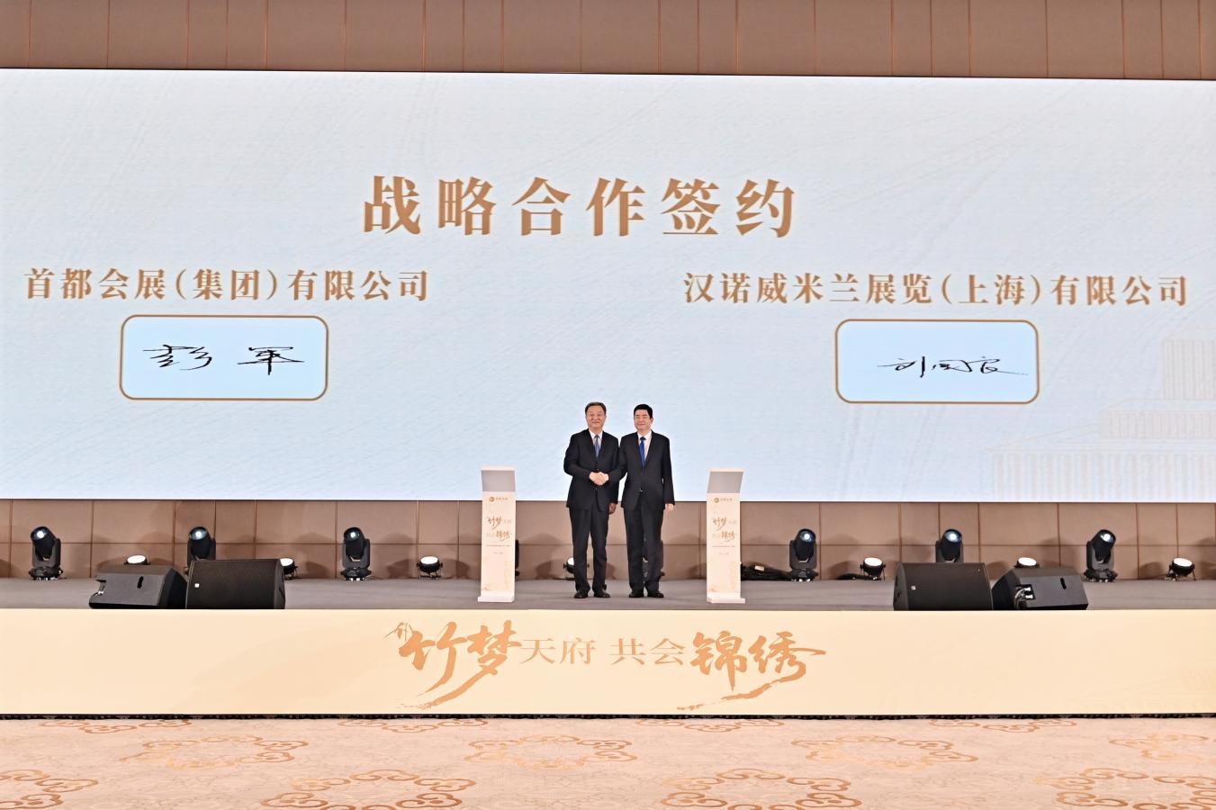 在活动的战略合作签约仪式上,首都会展集团分别与汉诺威米兰展览(上海)有限公司、全国会展工作委员会、原创中国签署了战略合作协议。本次签约标志着首都会展集团与各行业领军机构强强联手,共同打造具有行业影响力的展览项目,整合会展产业链优质资源,构建开放协同的产业生态。